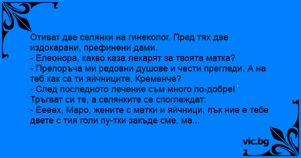 Отиват две селянки на гинеколог. Пред тях две издокарани, префинени дами.