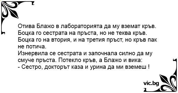 Отива Блажо в лабораторията да му вземат кръв. Боцка го сестрата на пръста, но не теква кръв. Боцка го на втория, и на третия пръст, но кръв пак не потича.