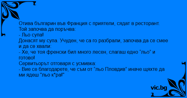 Отива българин във Франция с приятели, сядат в ресторант. Той започва да поръчва: