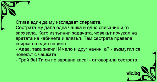 Сестрата му дала една чашка и едно списание и го зарязала. Като изпълнил задачата, човекът почукал на вратата на кабинета и влязъл. Там сестрата правела cbиpka на един пациент.