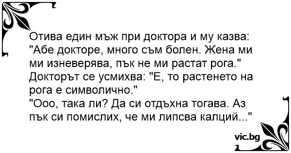 "Абе докторе, много съм болен. Жена ми ми изневерява, пък не ми растат рога."
