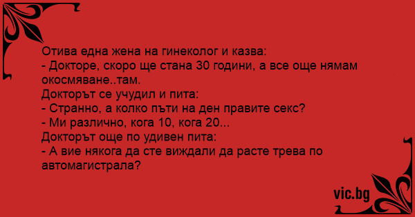 Mlada dama došla kod ginekologa. - "Doktore, pomagajte ! Otpale su mi sve stidne dlake." - "Koliko često imate seks?" - "Tri do četiri puta dnevno." - "Ne sekirajte se. Ni na autoputu nema trave."