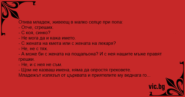 Оди Трпе кај селскиот поп да се исповеда. - Оче згрешив, најсрамниот грев го направив! - Кажи чедо, Бог е милостив ќе ти прости... - Не можам оче срам ми е! - Да не е со Митра на воденичарот? - Не...