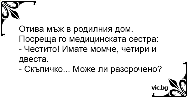 Отива мъж в родилния дом. Посреща го медицинската сестра: