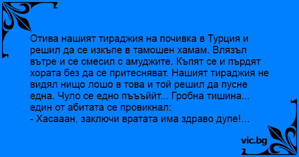 Отива нашият тираджия на почивка в Турция и решил да се изкъпе в тамошен хамам. Влязъл вътре и се смесил с амуджите. Къпят се и пърдят хората без да се притесняват. Нашият тираджия не видял нищо лошо в това и той решил да пусне една. Чуло се едно пъъъййт... Гробна тишина... един от абитата се провикнал: