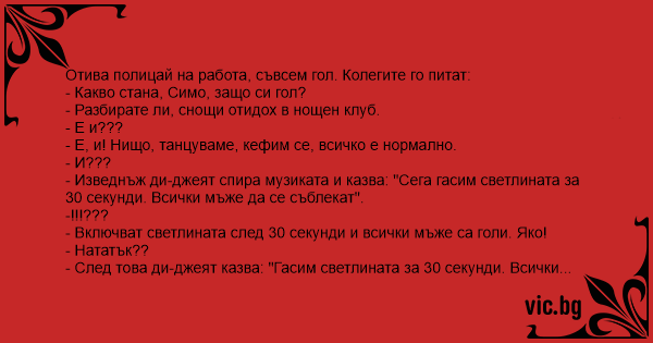 Полицаец оди на работа гол. Го прашуваат: - Што се случи, Васко, зошто си гол? - А да... вчера бев во ноќен клуб... - И? - И играв, играв и се беше во ред... - И? - И тогаш диџејот ја запира...