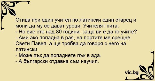 Отива при един учител по латински един старец и моли да му се дават уроци. Учителят пита: