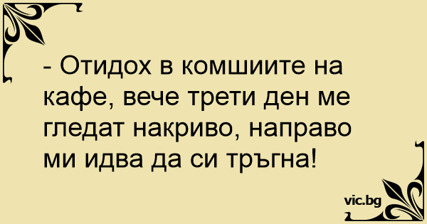 - Отидох в комшиите на кафе, вече трети ден ме гледат накриво, направо ми идва да си тръгна!