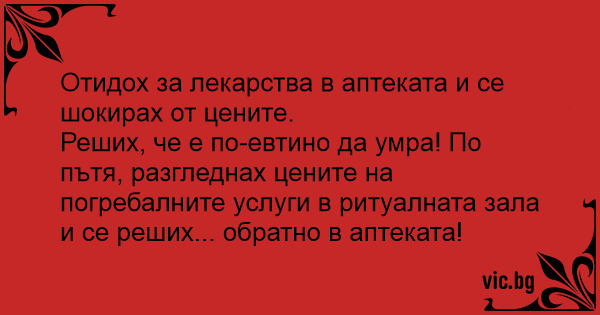 Реших, че е по-евтино да умра! По пътя, разгледнах цените на погребалните услуги в ритуалната зала и се реших... обратно в аптеката!