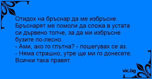 Отидох на бръснар да ме избръсне. Бръснарят ме помоли да сложа в устата си дървено топче, за да ми избръсне бузите по-лесно.