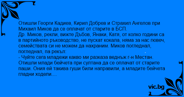 Др. Миков, рекли, вижте Дъбов, Янаки, Катя, от колко години са в партийното ръководство, не пускат кокала, няма за нас гювеч, семействата си не можем да нахраним. Миков погледнал, погледнал, па рекъл: