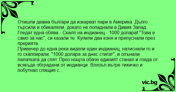 Гледат една обява - Скалп на индианец - 1000 долара! "Това е само за нас", си казали те. Купили два коня и препуснали през прерията.