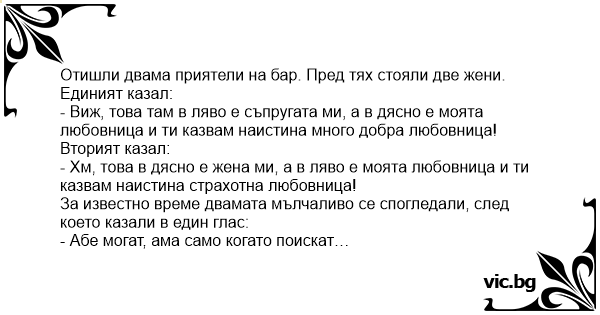 - Хм, това в дясно е жена ми, а в ляво е моята любовница и ти казвам наистина страхотна любовница!