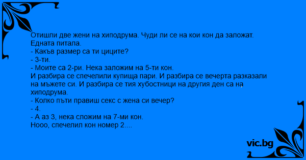 Отишли две жени на хиподрума. Чуди ли се на кои кон да заложат. Едната питала.