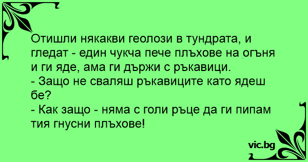 Отишли някакви геолози в тундрата, и гледат - един чукча пече плъхове на огъня и ги яде, ама ги държи с ръкавици.