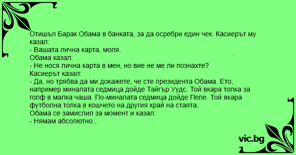 Отишъл Барак Обама в банката, за да осребри един чек. Касиерът му казал: