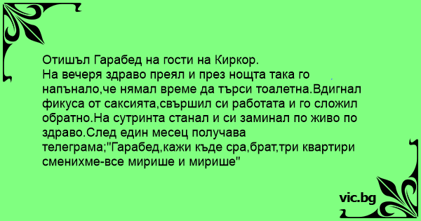 На вечеря здраво преял и през нощта така го напънало,че нямал време да търси тоалетна.Вдигнал фикуса от саксията,свършил си работата и го сложил обратно.На сутринта станал и си заминал по живо по здраво.След един месец получава телеграма;"Гарабед,кажи къде сра,брат,три квартири сменихме-все мирише и мирише"