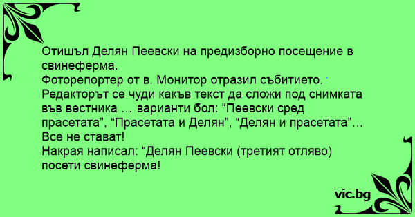Редакторът се чуди какъв текст да сложи под снимката във вестника … варианти бол: “Пеевски сред прасетата”, “Прасетата и Делян”, “Делян и прасетата”… Все не стават!