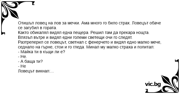 Разтреперил се ловецът, светнал с фенерчето и видял едно малко мече, седнало на гърне, стои и го гледа. Минал му малко страха и попитал: