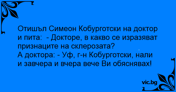 Отишъл Симеон Кобурготски на доктор и пита: - Докторе, в какво се изразяват признаците на склерозата?