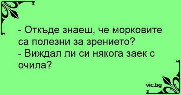 Пацієнт запитує в лікаря: — Лікарю, а правду кажуть, що від моркви зір покращується? — Правду кажуть! Ви коли-небудь бачили зайця в окулярах?