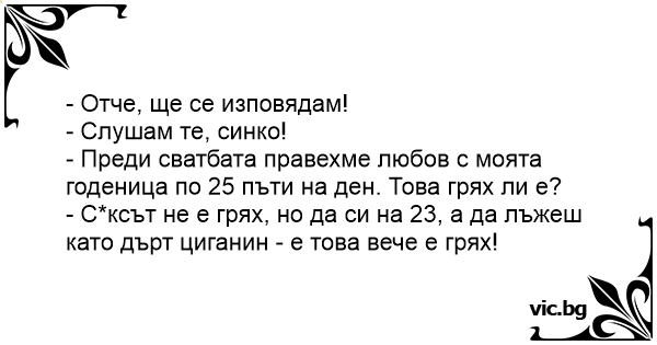 - Преди сватбата правехме любов с моята годеница по 25 пъти на ден. Това грях ли е?