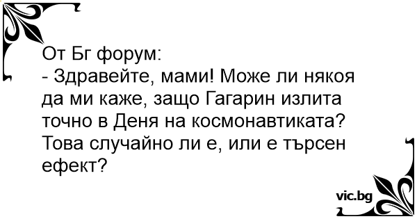 - Здравейте, мами! Може ли някоя да ми каже, защо Гагарин излита точно в Деня на космонавтиката? Това случайно ли е, или е търсен ефект?
