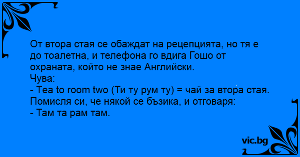 - Тea to room two (Ти ту рум ту) = чай за втора стая.
