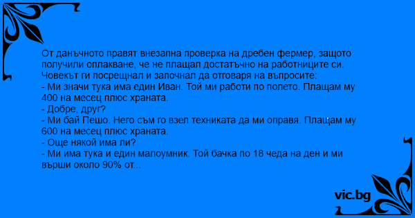 - Ми има тука и един малоумник. Той бачка по 18 чеда на ден и ми върши около 90% от работата. Изкарва по около 50 на месец, сам си плаща храната, ама всяка събота му купувам по бутилка ракия...