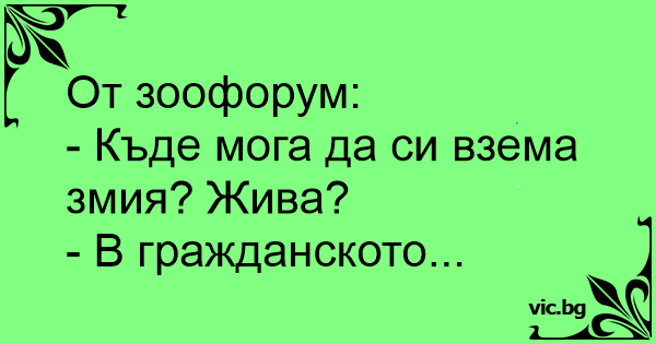 От зоофорум:<br />- Къде мога да си взема змия? Жива?<br />- В гражданското...