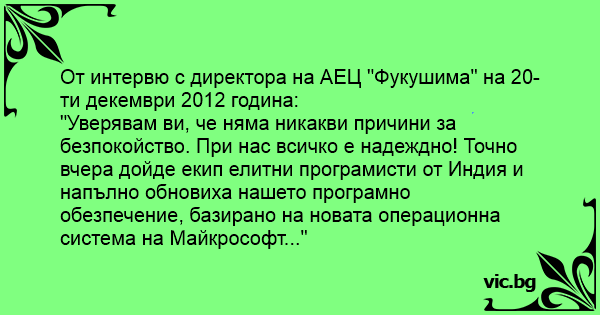 От интервю с директора на АЕЦ "Фукушима" на 20-ти декември 2012 година:
