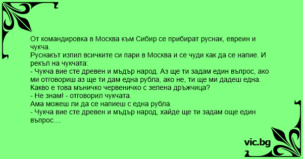 - Две череши бе чукча- казал руснака взел парите и отишъл да пие.