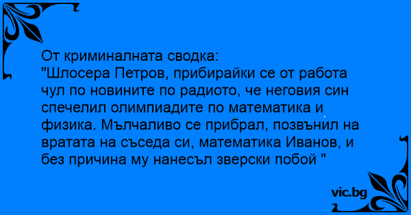 "Шлосера Петров, прибирайки се от работа чул по новините по радиото, че неговия син спечелил олимпиадите по математика и физика. Мълчаливо се прибрал, позвънил на вратата на съседа си, математика Иванов, и без причина му нанесъл зверски побой "