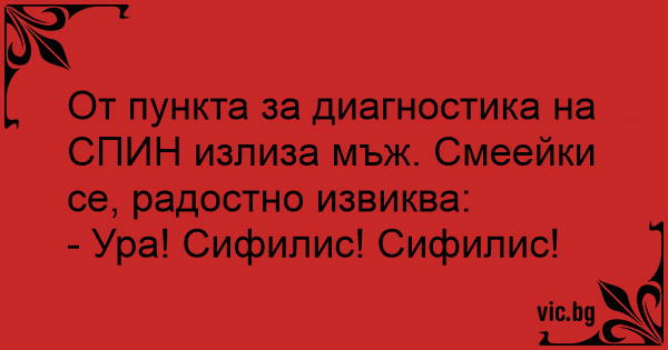От пункта за диагностика на СПИН излиза мъж. Смеейки се, радостно извиква: