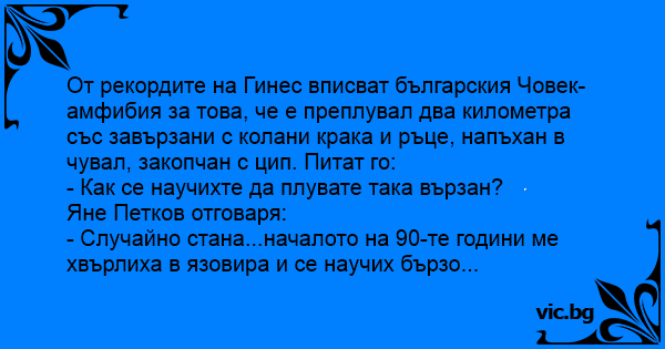 От рекордите на Гинес вписват българския Човек-амфибия за това, че е преплувал два километра със завързани с колани крака и ръце, напъхан в чувал, закопчан с цип. Питат го: