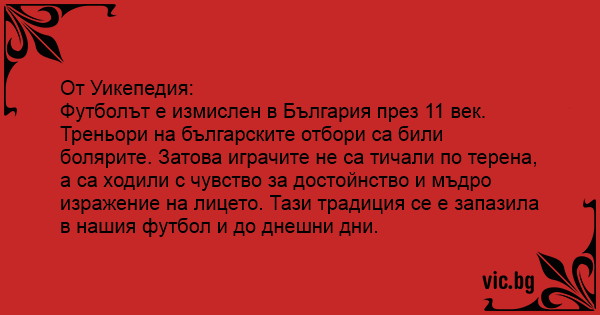Футболът е измислен в България през 11 век. Треньори на българските отбори са били болярите. Затова играчите не са тичали по терена, а са ходили с чувство за достойнство и мъдро изражение на лицето. Тази традиция се е запазила в нашия футбол и до днешни дни.