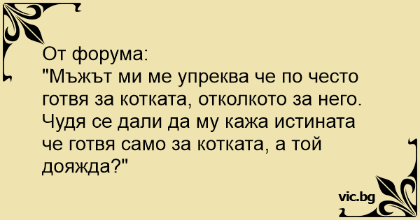 "Мъжът ми ме упреква че по често готвя за котката, отколкото за него. Чудя се дали да му кажа истината че готвя само за котката, а той дояжда?"