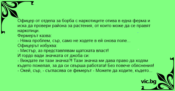 Офицер от отдела за борба с наркотиците отива в една ферма и иска да провери района за растения, от които може да се правят наркотици.