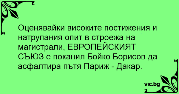 Оценявайки високите постижения и натрупания опит в строежа на магистрали, ЕВРОПЕЙСКИЯТ СЪЮЗ е поканил Бойко Борисов да асфалтира пътя Париж - Дакар.