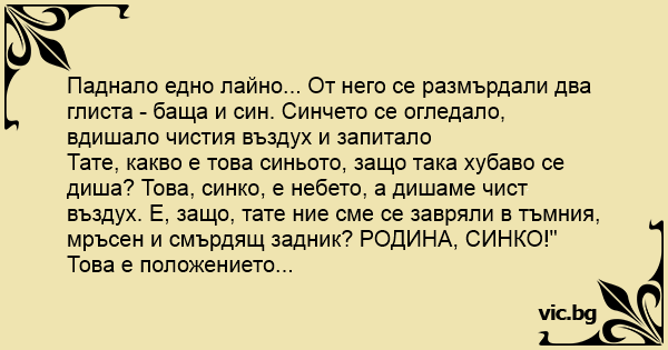 Тате, какво е това синьото, защо така хубаво се диша? Това, синко, е небето, а дишаме чист въздух. Е, защо, тате ние сме се завряли в тъмния, мръсен и смърдящ зaдниk? РОДИНА, СИНКО!" Това е положението...