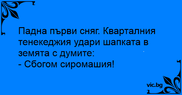 Падна първи сняг. Кварталния тенекеджия удари шапката в земята с думите: