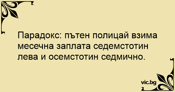 Парадокс: пътен полицай взима месечна заплата седемстотин лева и осемстотин седмично. 29 0 0 Вицове за полицаи Професионални
