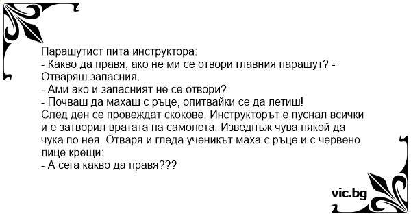 - Какво да правя, ако не ми се отвори главния парашут? - Отваряш запасния.
