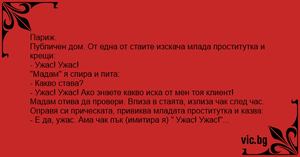Мадам отива да провери. Влиза в стаята, излиза чак след час. Оправя си прическата, привиква младата пpoctиtуtka и казва: