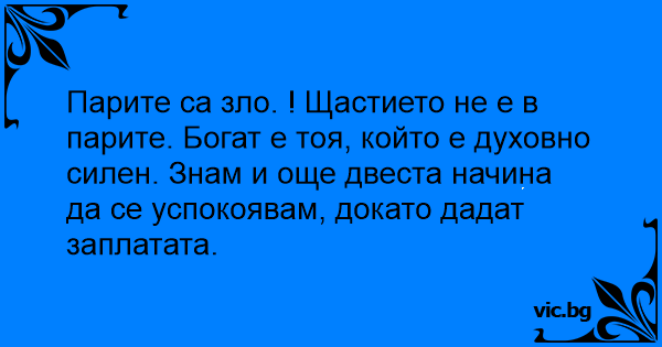 Парите са зло. ! Щастието не е в парите. Богат е тоя, който е духовно силен. Знам и още двеста начина да се успокоявам, докато дадат заплатата.