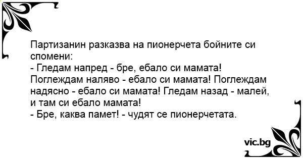- Гледам напред - бре, ебало си мамата! Поглеждам наляво - ебало си мамата! Поглеждам надясно - ебало си мамата! Гледам назад - малей, и там си ебало мамата!
