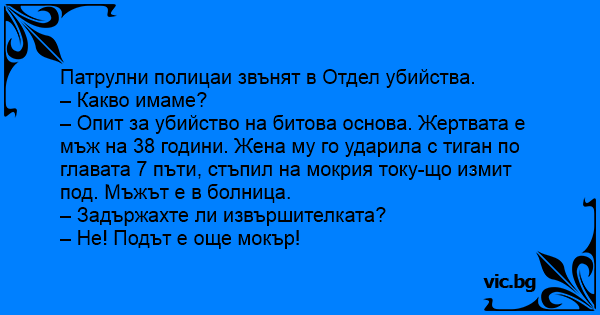 Во полициска станица: - Шефе, жена убила маж со 12 убоди. - Причина? - Одел бос додека го бришела подот. - Ја уапсивте? - Не, чекаме да се исуши подот.
