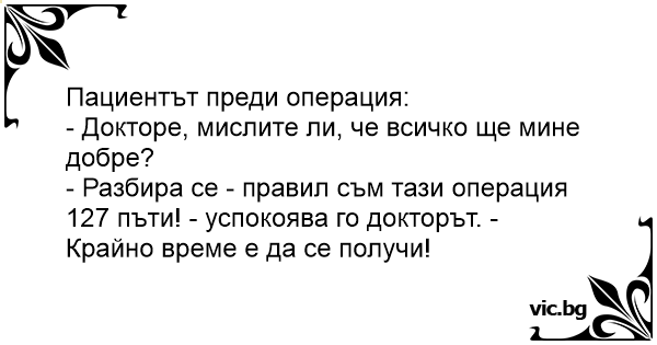 - Разбира се - правил съм тази операция 127 пъти! - успокоява го докторът. - Крайно време е да се получи!