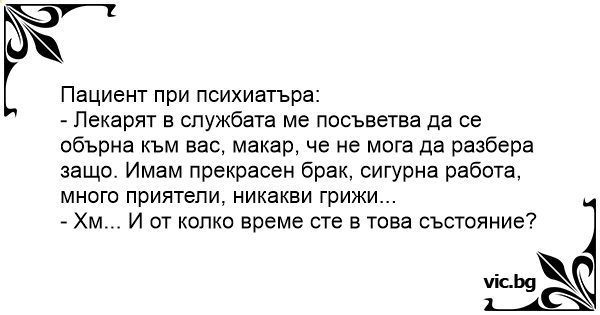 - Лекарят в службата ме посъветва да се обърна към вас, макар, че не мога да разбера защо. Имам прекрасен брак, сигурна работа, много приятели, никакви грижи...