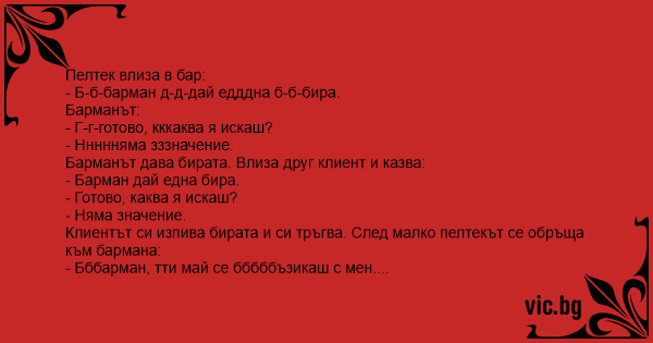 Клиентът си изпива бирата и си тръгва. След малко пелтекът се обръща към бармана: